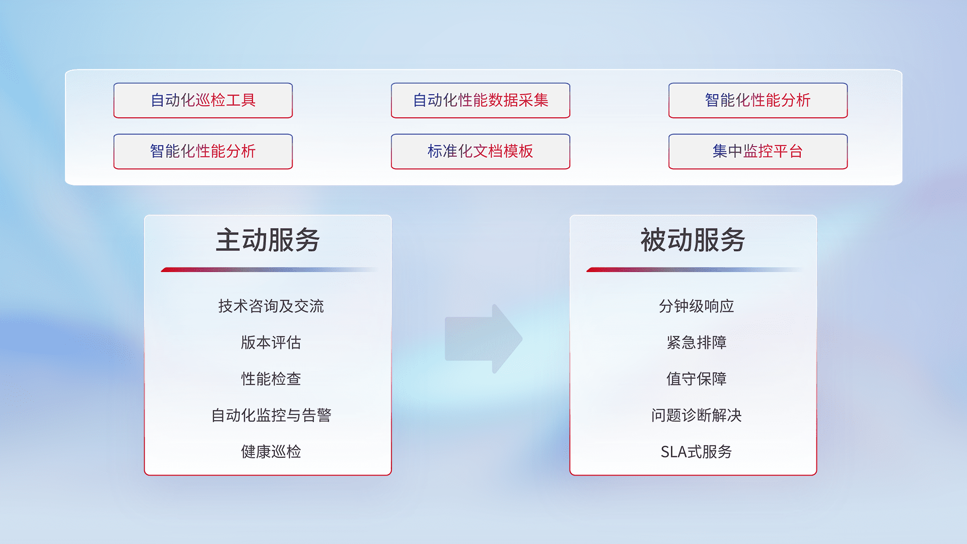智能化工具和标准化文档,,,,保障服务质量,,,提供主动服务(包含技术咨询、、、、版本评估、、、、性能检查、、自动化监控与告警、、、、健康巡检)和被动服务包含(分钟级响应、、紧急排障、、、值守保障、、、问题诊断解决、、、SLA服务)。。。